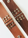 Muñequera de cuero de 4 cm de ancho con tachas de bronce y cierre con broche a presión.