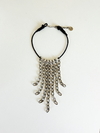 Una declaración de audacia y estilo. Esta gargantilla con cordón de cuero negro presenta una cascada de cadenas niqueladas que agrega un toque de sofisticación a cualquier atuendo. Diseñada para quienes buscan destacar, su diseño único y contemporáneo la convierte en el accesorio perfecto para ocasiones especiales o para elevar un look diario. Atrevete a ser diferente y no te pierdas esta pieza unica.