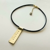 Colgante corto realizado con cordón de cuero negro y dije/chapa en bronce grabada con la palabra SARAVA, que en portugués significa "saludo y bendición".